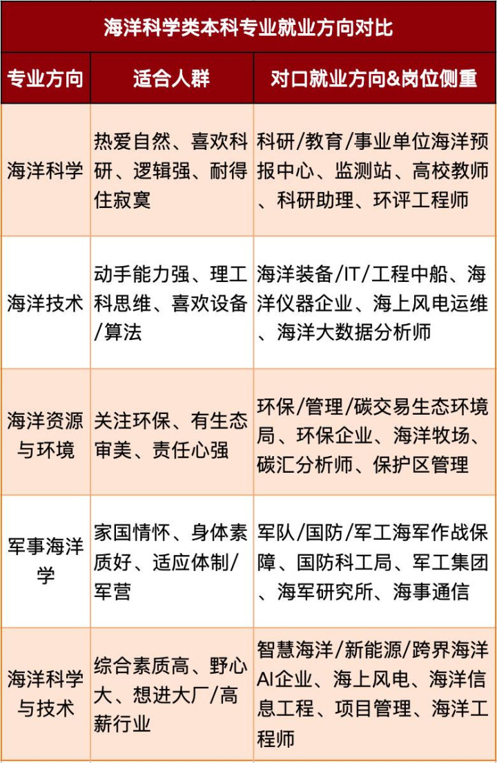 该类专科服务标的疏漏相仿有交叉,毕业生主要服务标的有可履新于水质处置、浑水处置产业;海水淡化、发电等产业履新(海洋物理、海西化学类专科);水产衍生、海洋捕捞等产业;渔会、渔船公司;考公参加天然资源/海洋局、海事局、生态环境局、海洋预告中心、监测站、海关、渔政等,不同专科服务标的相反如下。