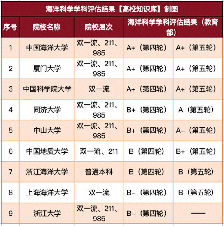 讲明注解部第五轮学科评估未向社会公开,但把柄各校裸露以及参考汇聚信息,已统计有5所大学的海洋科学学科在第五轮获评A-及以上,其中海大、厦大、国科大3校获评A+,并排第一梯队。