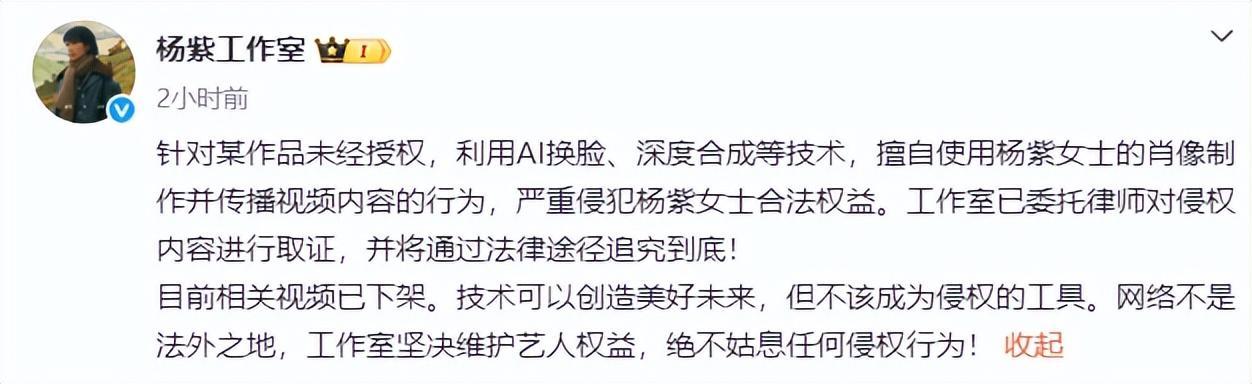 搜狐文娱讯 近日,网曝有AI短剧使用了杨紫的肖像,激勉热议。20日,杨紫责任室发文回话称:“针对某作品未经授权,金博宝app手机版愚弄AI换脸、深度合成等时期,私自使用杨紫女士的肖像制作并传播视频试验的举止,金佰利国际娱乐官网入口严重骚动杨紫女士正当职权。责任室已录用讼师对侵权试验进行取证,并将通过法律阶梯根究到底!”
