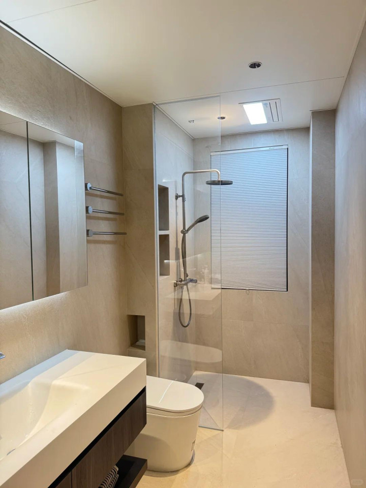 宽度方面,提倡留1.8米傍边,凹凸浮动10公分都是相比惬意的。这个宽度保证了淋浴房、马桶、浴室柜之间有鼓胀的走说念空间,不会以为拥堵。