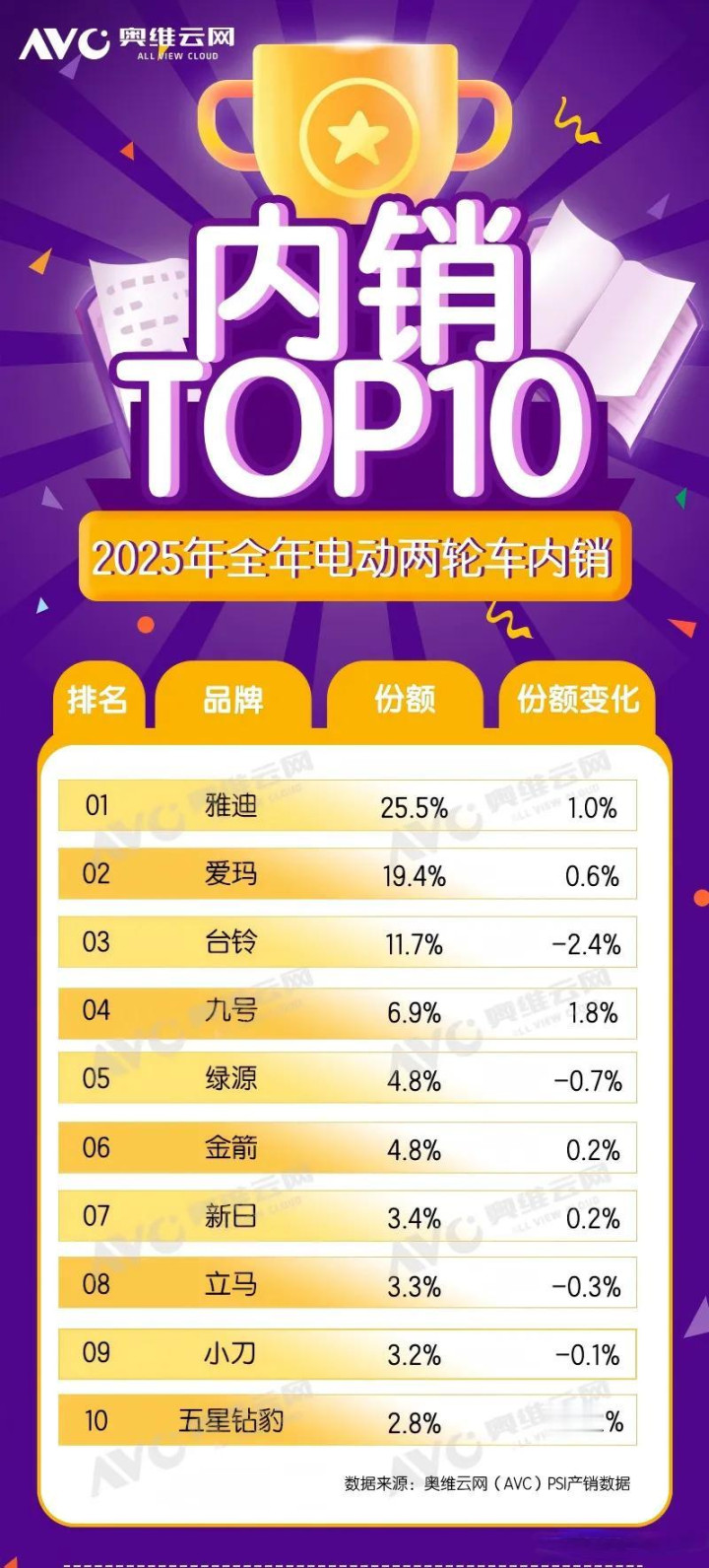 确认奥维云网(AVC)数据深切,2025年中国电动两轮车内销总量达到5876.7万辆,同比增长16.6%。雅迪、爱玛、台铃稳居前三,名次4-10位的次第是九号、绿源、金箭、新日、立马、小刀、五星钻豹。