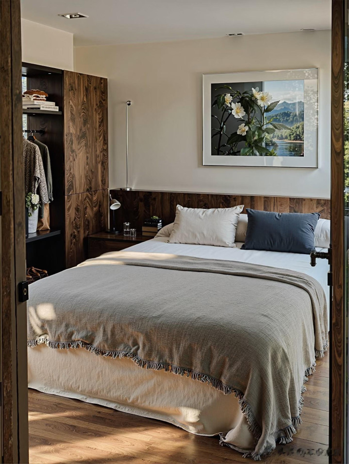 卧室的移交稳健全体的调性,床头木板的半墙诡计,有拉伸层高的视觉效力,素色的棉麻床品,为空间增添了一份轻松。