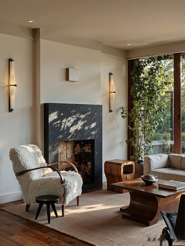 壁炉元素的加入,玄色大理石,对称布局的壁灯,彰显出这对夫妇的审好意思品位。