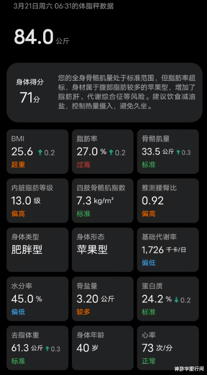 这是最近刚测的体重,体内脂肪颠倒多,体重严重超标。