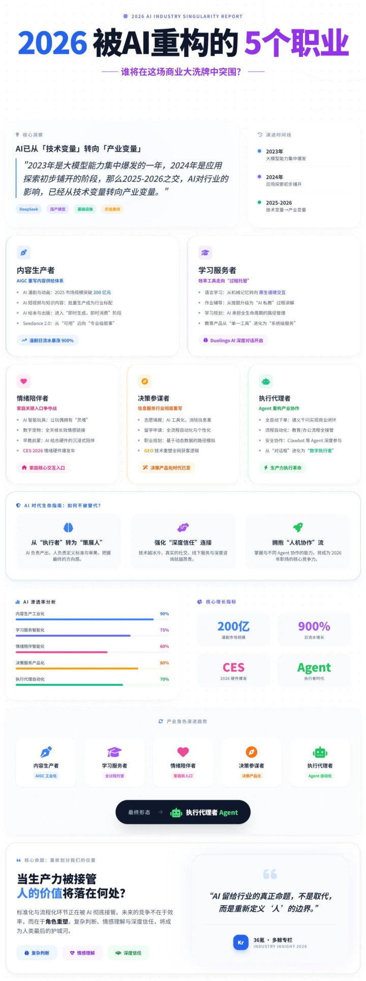 36氪与多鲸集会发布的《2026被AI重构的5个奇迹》产业细察敷陈给出了一个明晰的判断:AI已从“时期变量”转向“产业变量”。这意味着,夙昔两年咱们谋划的是“AI能作念什么”,而如今的问题变成了“AI不成作念什么”——而阿谁“不成”的范围,正在快速减轻。