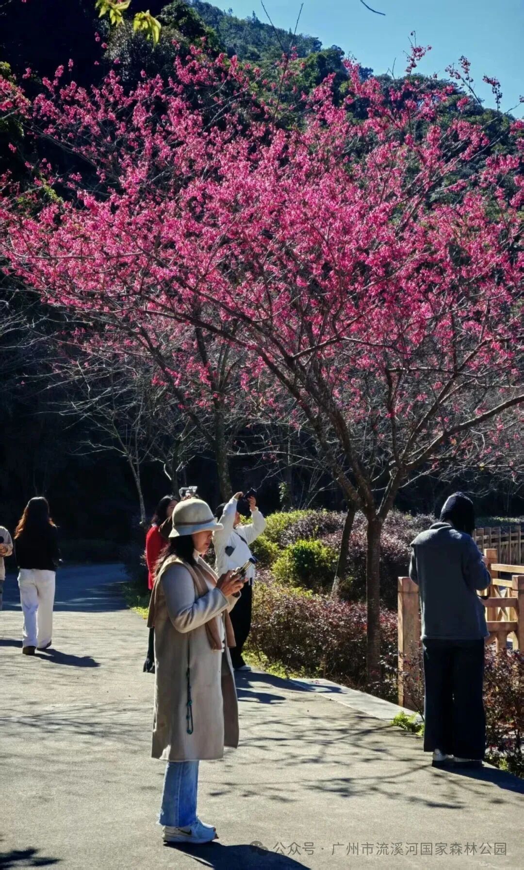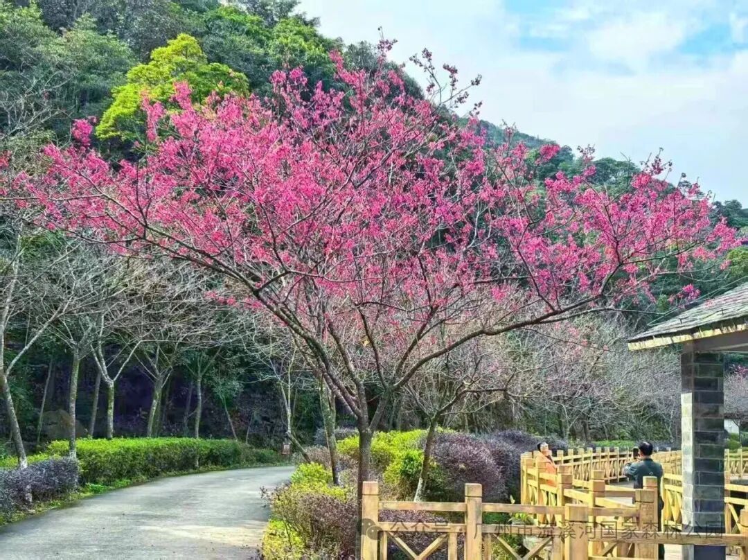 流溪河国度丛林公园五指山景区新月湖畔,千株福建山樱(钟花樱),已悄然绽放。倒钟形的绯红花苞在清风中摇曳,与清亮湖水、苍翠山峦景仰无尽,宛如大当然打翻的调色盘,将冬日山林晕染成诗意画卷。