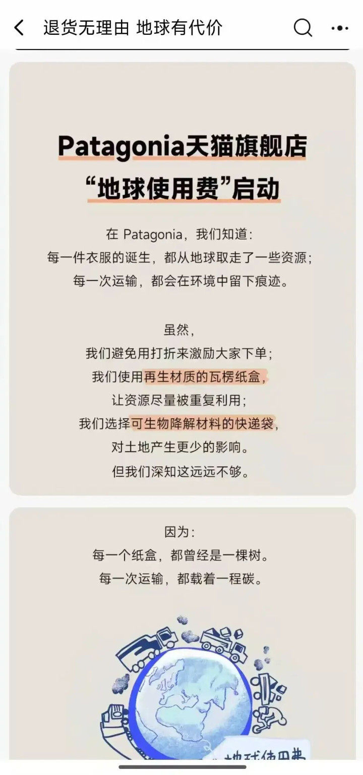 揽星蓝:Patagonia的地球使用费其实也可以招供,他们一直以保护环境为理念,穿着也可以,保护生态吧!网购包装退货的碳排放果然很夸张,品牌用这种模式亦然命令全球感性消费。