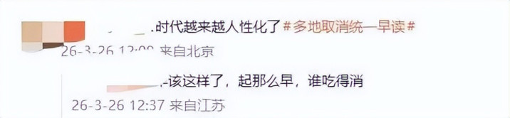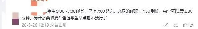也有家长对“取消早读”抓保留格调,“其实早读如故挺好的,不外不错迟点。”“学生9:00~9:30睡觉,早上7:00起床,饱和的就寝,7:50到校,十足不错晨读30分钟。为什么要取消?督促学生早点睡不就行了。”