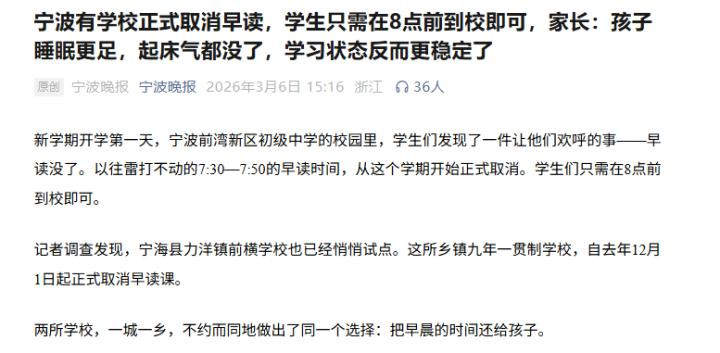 据宁波晚报报谈,从这个学期运行,宁波前湾新区低级中学以往雷打不动的7:30—7:50的早读本领崇敬取消,学生只需要在8点前到校即可。