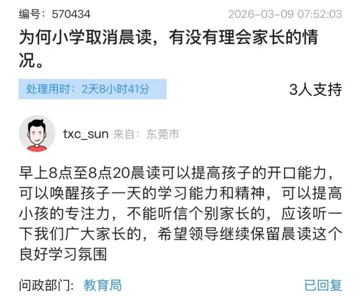 东莞市解释局发布取消赈济读的见知后,有市民3月9日在东莞问政平台上建议建议:“早上8点至8点20晨读不错擢升孩子的启齿才略,不错叫醒孩子一天的学习才略和精神,不错擢升小孩的专注力,不可听信个别家长的,应该听一下咱们广寰球长的,但愿结合连接保留晨读这个风雅无比学习氛围。”
