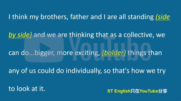 先盲听一遍。i think my brother's father and i are all standing side by side and we're thinking that as a collective,we can do.bigger more exciting, bolder things than any of us could do individually, so that's how we try to look at it.