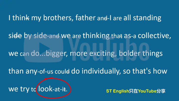 底下我来按照元素跟读一遍,各人看一看下绕线的部分能不成听出来是什么单词。i think my brothers,father and i are all standing side by side and we are thinking that as a collective,we can do.bigger more exciting, (bolder) things than ST English只在YouTube共享。