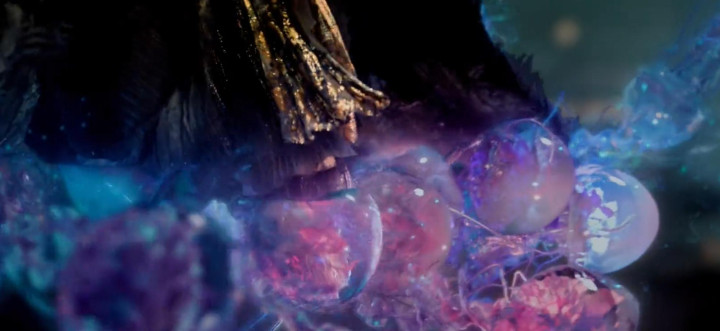 而且仔细一看,那些“小水母”的大脑袋像一个个胎盘,内部还有近似胚胎组织的东西,这个遐想也很精妙——